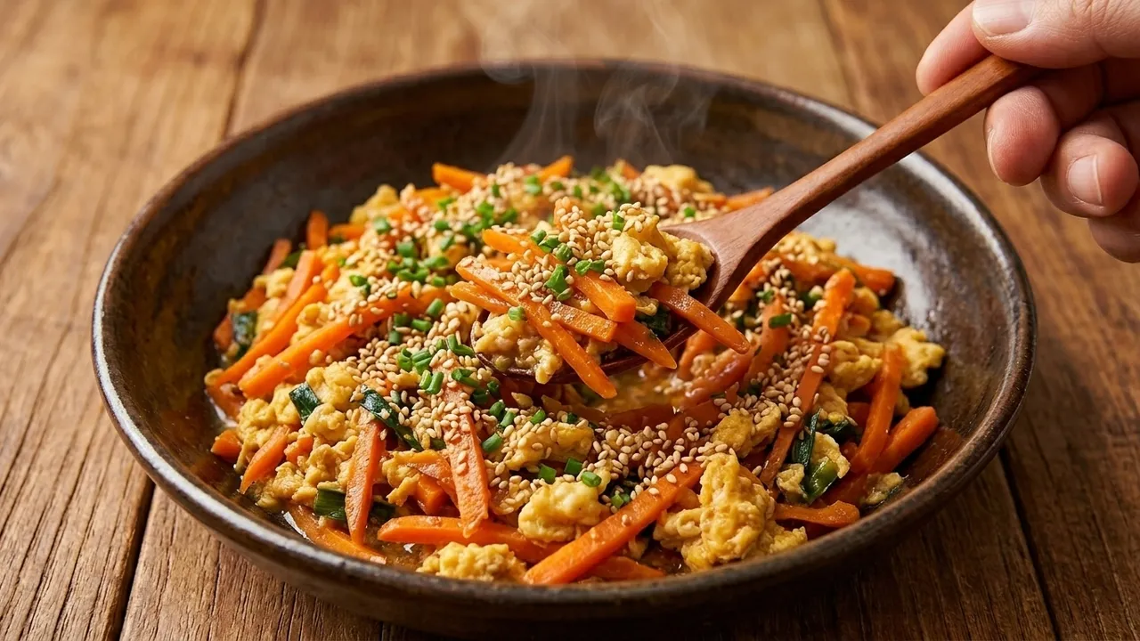 이 레시피의 첫 번째 포인트는 계란을 부드럽게 스크램블 하는 거예요. 달걀을 팬에 넣고 너무 많이 치대지 말고 나무주걱으로 쓱쓱 밀어주듯 익혀야 부드러운 식감을 살릴 수 있습니다. 두 번째는 당근을 충분히 볶아주는 것! 당근은 기름에 볶을수록 단맛이 극대화되어 설탕 없이도 달콤하고 깊은 맛을 낸답니다. 마지막으로 굴소스는 처음부터 많이 넣기보다 조금씩 추가하며 간을 맞추는 게 중요해요. 팬 끝에 맛술을 살짝 뿌려주면 잡내도 잡고 풍미가 더 좋아진다는 점, 꼭 기억하세요!